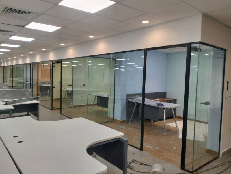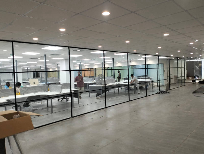 We have an expert team to build perfect office glass partition works. We use glass types ranging from 10mm to 20mm toughened (tempered) clear glass. This thickness is used for indoor office partitions such as office cabins, conference rooms, and meeting enclosures. We also offer acoustic (soundproof) laminated glass options, frosted or film-coated privacy designs, and sliding or hinged door installations.
